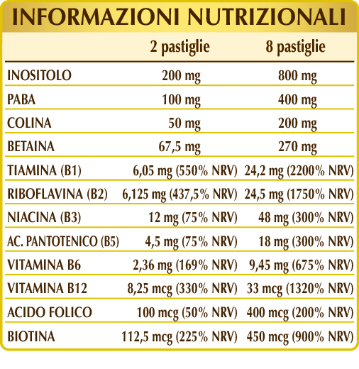Integratore alimentare contenente tutte le vitamine del gruppo B. In particolare le vitamine B6 e B12 favoriscono la normale formazione dei globuli rossi e, insieme alle vitamine B2, B3, B5 e all’acido folico, riducono stanchezza e affaticamento. Le vitamine B1, B3, B6, B12 e la biotina promuovono la funzionalità del sistema nervoso e con l’intervento dell’acido folico, risultano utili per mantenere la normale funzione psicologica. Le vitamine B6, B12 e l’acido folico sono indispensabili anche per la normale funzione del sistema immunitario.