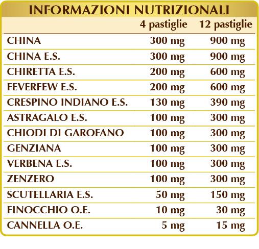 China (Cinchona calisaya) cortecce polvere, chiodi di garofano (Eugenia caryophyllata) gemme floreali polvere, genziana (Gentiana lutea) radici polvere, zenzero (Zingiber officinalis) rizomi polvere, scutellaria (Scutellaria baicalensis) radici E.S. (titolato al 95% in baicalina), feverfew o crisantemo partenio (Tanacetum parthenium) capolini (fiori) E.S. (titolato allo 0,8% in partenolide), crespino indiano (Berberis aristata) cortecce dei rami E.S. (titolato al 97% in berberina), china (Cinchona calisaya) cortecce E.S. (titolato al 99% in chinino solfato), cellulosa microcristallina°, gomma arabica°, silicio biossido°°, finocchio (Foeniculum vulgare) frutti O.E., magnesio stearato di origine vegetale°°, cannella (Cinnamomum zeylanicum) cortecce O.E.