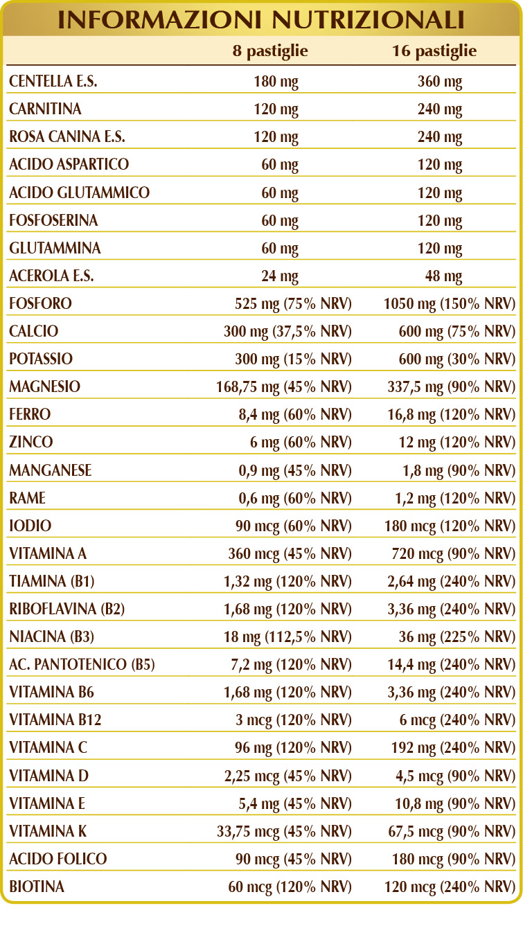 Magnesio glicerofosfato, calcio fosfato bibasico, potassio fosfato bibasico, cellulosa microcristallina°, gomma arabica°, centella (Centella asiatica) erba E.S. (titolato al 20% in derivati triterpenici), acetil (L-)carnitina, rosa canina (Rosa canina) frutti E.S. (titolato al 70% in vitamina C), silicio biossido°°, acido (L-)aspartico, acido (L-)glutammico, (DL-)fosfoserina, (L-)glutammina, citrato ferrico di ammonio, calcio carbonato, magnesio ossido, zinco gluconato, acerola (Malpighia glabra) frutti E.S. (titolato al 50% in vitamina C), magnesio stearato di origine vegetale°°, vitamina B3 (nicotinamide), vitamina E di origine vegetale (acetato di D-α-tocoferile), vitamina B5 (pantotenato di calcio), manganese gluconato, rame gluconato, vitamina A (acetato di retinile), vitamina B6 (piridossina cloridrato), vitamina B2 (riboflavina), vitamina B1 (tiamina cloridrato), vitamina K1 (fillochinone), potassio ioduro, acido folico, biotina, vitamina B12 (cianocobalamina), vitamina D3 (colecalciferolo) di origine vegetale (estratta da lichene Cladonia rangiferina).
