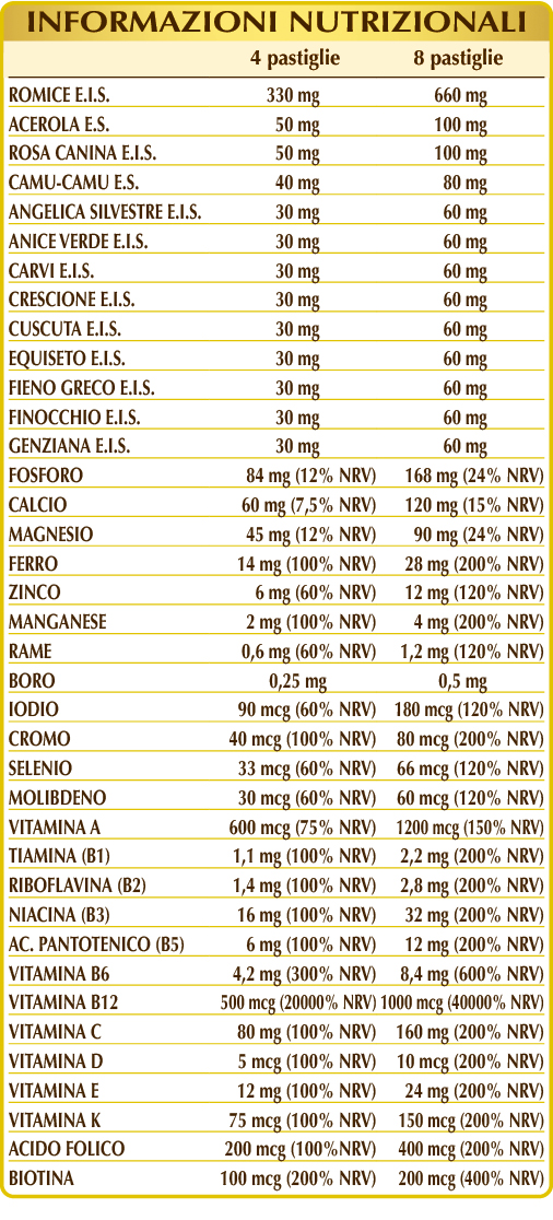Romice (Rumex crispus) radici E.I.S., calcio fosfato bibasico, magnesio glicerofosfato, cellulosa microcristallina°, gomma arabica°, citrato ferrico di ammonio, acerola (Malpighia glabra) frutti E.S. (titolato al 50% in vitamina C), rosa canina (Rosa canina) frutti E.I.S. (titolato al 70% in vitamina C), zinco gluconato, camu-camu (Myrciaria dubia) frutti E.S. (titolato al 50% in vitamina C), silicio biossido°°, angelica silvestre (Angelica sylvestris) radici E.I.S., anice verde (Pimpinella anisum) frutti E.I.S., carvi o cumino dei prati (Carum carvi) frutti E.I.S., crescione (Nasturtium officinale) erba E.I.S., cuscuta (Cuscuta epithymum) erba E.I.S., equiseto o coda cavallina (Equisetum arvense) erba E.I.S., fieno greco (Trigonella foenum-graecum) semi E.I.S., finocchio (Foeniculum vulgare) frutti E.I.S., genziana (Gentiana lutea) radici E.I.S., magnesio ossido, vitamina E di origine naturale (acetato di D-α-tocoferile), manganese gluconato, vitamina B3 (nicotinamide), magnesio stearato di origine vegetale°°, vitamina B5 (pantotenato di calcio), vitamina B6 attivata (piridossale-5-fosfato), rame gluconato, vitamina A (acetato di retinile), vitamina B2 attivata (riboflavina 5-fosfato di sodio), sodio borato, lichene (Cladonia rangiferina) tallo E.S. (titolato in vitamina D3 colecalciferolo 100.000 UI/g), vitamina B1 (tiamina cloridrato), vitamina B12 attivata (5-deossiadenosilcobalamina, metilcobalamina), cromo picolinato, acido folico attivato (L-metilfolato di calcio), potassio ioduro, biotina, sodio molibdato, vitamina K1 (fillochinone), sodio selenito.