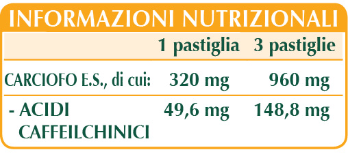 Carciofo (Cynara scolymus) foglie E.S. (titolato al 15,5% in acidi caffeilchinici, espressi come acido clorogenico), cellulosa microcristallina°, gomma arabica°, silicio biossido°°, magnesio stearato di origine vegetale°°. °Agente di carica. °°Antiagglomerante.
