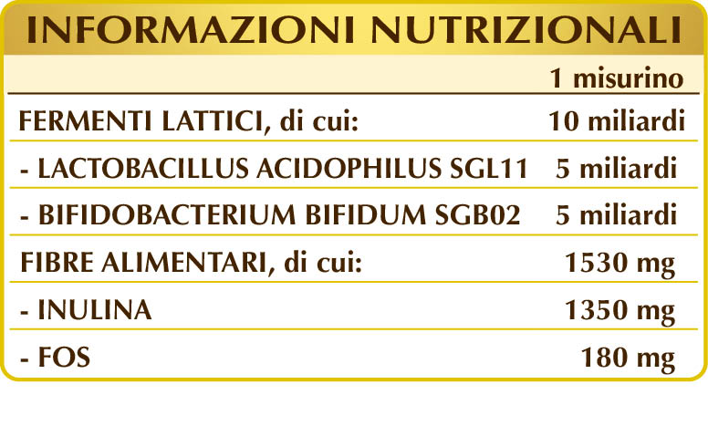 Inulina da cicoria radici, maltodestrine da mais o riso, FOS (frutto-oligosaccaridi), fermenti lattici (Lactobacillus acidophilus SGL11 e Bifidobacterium bifidum SGB02).