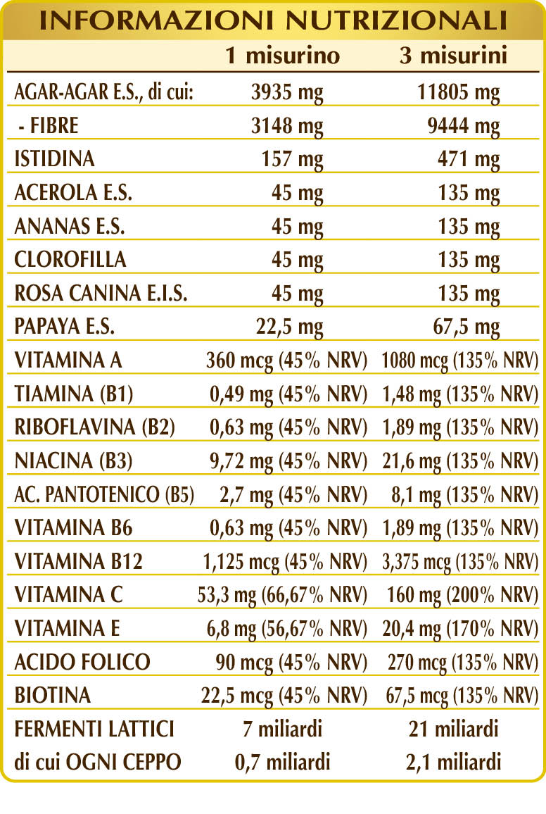 L’agar-agar è una fibra solubile che non viene digerita né assorbita dall’intestino; essa normalizza il volume e la consistenza delle feci favorendo la regolarità del transito intestinale. I fermenti lattici probiotici possono essere utili per riequilibrare la naturale flora batterica intestinale. Con l’aggiunta di clorofilla, vitamine e altri nutritivi. In particolare, le vitamine B6, B12 e C aiutano a ridurre la stanchezza e l’affaticamento e sostengono, insieme alla vitamina A e all’acido folico, la funzione del sistema immunitario.