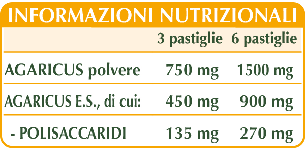 Agaricus (Agaricus blazei Murill o Agaricus subrufescens Peck) sporoforo (fungo) polvere, agaricus (Agaricus blazei Murill o Agaricus subrufescens Peck) sporoforo (fungo) E.S. (titolato al 30% in polisaccaridi), cellulosa microcristallina°, gomma arabica°, silicio biossido°°, magnesio stearato di origine vegetale°°.