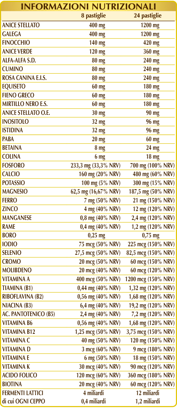 Magnesio glicerofosfato, calcio fosfato bibasico, anice stellato (Illicium verum) frutti Plv, galega (Galega officinalis) erba con fiori Plv, gomma arabica°, cellulosa microcristallina°, calcio glicerofosfato, potassio fosfato bibasico, finocchio (Foeniculum vulgare) frutti Plv, anice verde (Pimpinella anisum) frutti Plv, alfa-alfa o erba medica (Medicago sativa) erba con fiori S.D., cumino (Cuminum cyminum) frutti Plv, rosa canina (Rosa canina) frutti E.I.S. (titolato al 50% in vitamina C), equiseto o coda cavallina (Equisetum arvense) erba Plv, fieno greco (Trigonella foenum-graecum) semi Plv, mirtillo nero (Vaccinium myrtillus) frutti E.S. (titolato al 25% in antocianosidi), citrato ferrico di ammonio, zinco gluconato, mio-inositolo di origine vegetale (estratto da semi di mais), (L-)istidina, anice stellato (Illicium verum) frutti O.E., silicio biossido°°, PABA (acido paminobenzoico), miscela di fermenti lattici (titolata al 10% in ognuno dei seguenti ceppi: Bifidobacterium bifidum SD5215, breve SD5206, lactis SD5219; Lactobacillus acidophilus SD5212, brevis SD5214, bulgaricus SD5589, casei SD5213, paracasei SD5275, plantarum SD5209, rhamnosus SD5217), magnesio stearato di origine vegetale°°, colina tartrato, vitamina E di origine vegetale (acetato di D-α-tocoferile), magnesio ossido, betaina, manganese gluconato, vitamina B3 (nicotinamide), rame gluconato, vitamina A (acetato di retinile), vitamina B5 (pantotenato di calcio), sodio borato, lichene (Cladonia rangiferina) tallo E.S. (titolato in vitamina D3 colecalciferolo 100.000 UI/g), vitamina B2 attivata (riboflavina 5-fosfato di sodio), vitamina B6 attivata (piridossale-5-fosfato), vitamina B1 (tiamina cloridrato), cromo picolinato, acido folico attivato (L-metilfolato di calcio), potassio ioduro, sodio selenito, sodio molibdato, vitamina K1 (fillochinone), biotina, vitamina B12 attivata (5-deossiadenosilcobalamina, metilcobalamina).