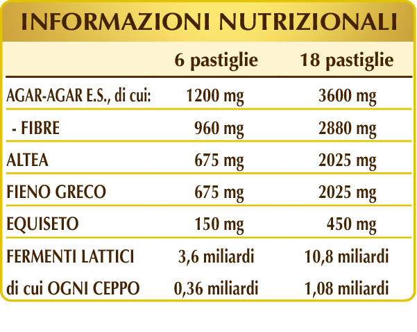 L’agar-agar è una fibra che non viene digerita né assorbita dall’intestino; essa normalizza il volume e la consistenza delle feci e, insieme all’altea, promuove la regolarità del transito intestinale. Altea e fieno greco sono ricche di mucillaggini e svolgono un’azione emolliente e lenitiva sul sistema digerente. Inoltre, i fermenti lattici probiotici* favoriscono l’equilibrio della flora batterica intestinale.