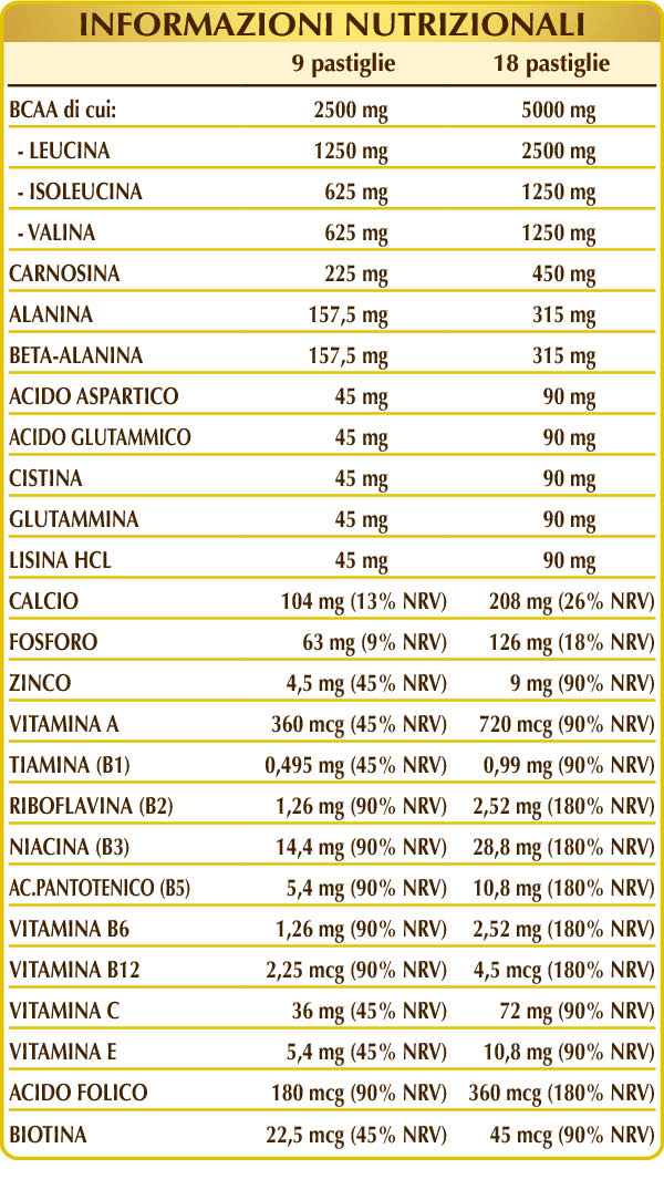 BCAA= Branched-chain amino acids (aminoacidi a catena ramificata). NRV= Valore nutritivo di Riferimento.