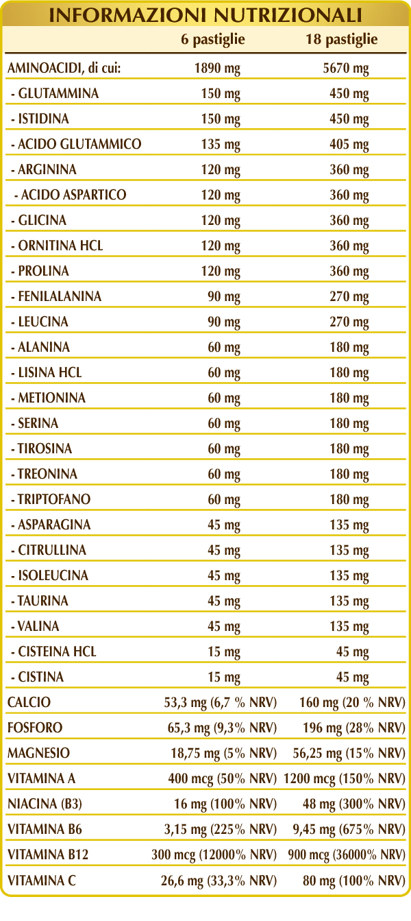 Integratore contenente una miscela completa di tutti gli aminoacidi, con l’aggiunta di minerali e vitamine. É particolarmente ricco di vitamina B6 che contribuisce al metabolismo delle proteine, del glicogeno e dell’omocisteina, alla regolazione dell’attività ormonale, alla riduzione della stanchezza e dell’affaticamento, alla normale formazione dei globuli rossi, al normale funzionamento del sistema immunitario e nervoso e alla normale funzione psicologica. Gli aminoacidi, inoltre, sono utili per contribuire al soddisfacimento del fabbisogno proteico/azotato laddove nell’organismo le proteine favoriscono il mantenimento della salute delle ossa e la crescita della massa muscolare. Infine, calcio e magnesio coadiuvano la normale funzione muscolare e, insieme a tutte le vitamine contenute, sostengono il metabolismo energetico.