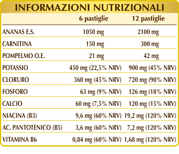 Ananas (Ananas comosus) gambi dei frutti E.S. (bromelina 2500 GDU/g), potassio cloruro, cellulosa microcristallina°, gomma arabica°, calcio fosfato bibasico, (L-)carnitina, potassio fosfato bibasico, potassio citrato, silicio biossido°°, magnesio stearato di origine vegetale°°, pompelmo (Citrus paradisi) scorze dei frutti O.E., vitamina B3 (nicotinamide), vitamina B5 (pantotenato di calcio), vitamina B6 attivata (piridossale-5-fosfato).
