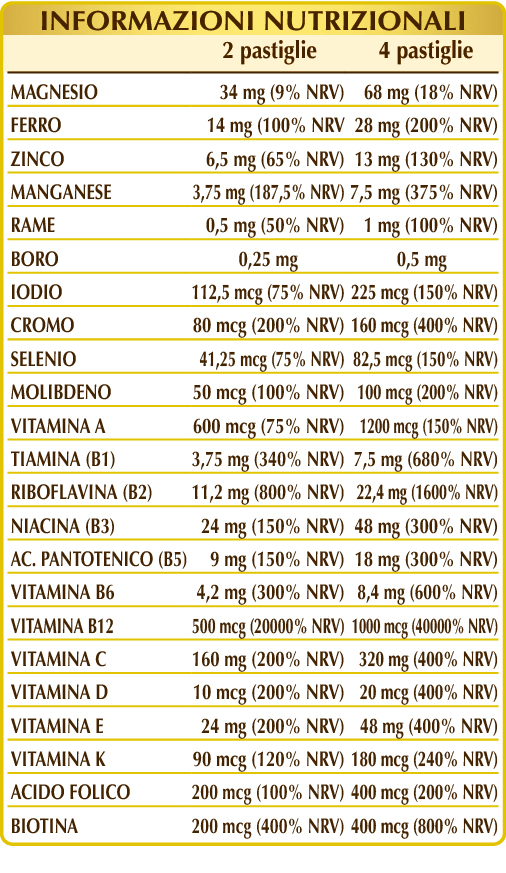 Vitamina C (acido ascorbico), calcio fosfato bibasico, cellulosa microcristallina°, gomma arabica°, citrato ferrico di ammonio, zinco gluconato, vitamina E di origine vegetale (acetato di D-α-tocoferile), magnesio ossido, magnesio citrato bibasico, manganese gluconato, vitamina B3 (nicotinamide), silicio biossido°°, vitamina B2 attivata (riboflavina 5-fosfato di sodio), magnesio stearato di origine vegetale°°, vitamina B5 (pantotenato di calcio), vitamina B6 attivata (piridossale-5-fosfato), vitamina B1 (tiamina cloridrato), lichene (Cladonia rangiferina) tallo E.S. (titolato in vitamina D3 colecalciferolo 100.000 UI/g), vitamina A (acetato di retinilie), rame gluconato, sodio borato, cromo picolinato, vitamina B12 attivata (5-deossiadenosilcobalamina, metilcobalamina), acido folico attivato (L-metilfolato di calcio), biotina, potassio ioduro, sodio molibdato, sodio selenito, vitamina K1 (fillochinone). E.S.= Estratto secco. °Agente di carica. °°Antiagglomerante.