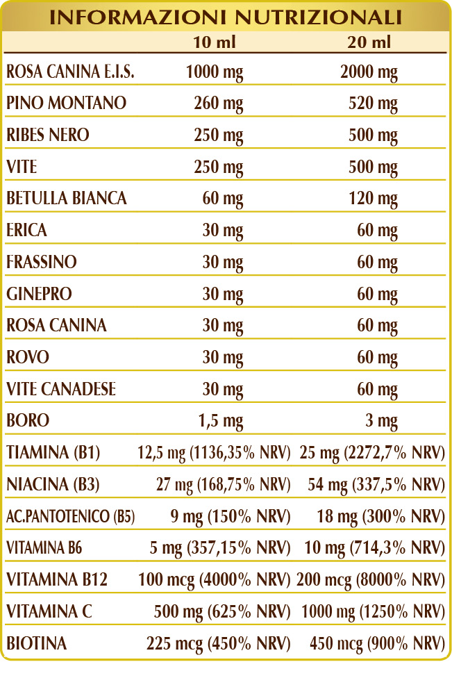 Glicerina vegetale bidistillata, acqua pura, rosa canina (Rosa canina) frutti E.I.S. (titolato al 50% in vitamina C); macerato glicerico di tessuti meristematici freschi di: pino montano (Pinus montana o Pinus mugo) gemme, ribes nero (Ribes nigrum) gemme, vite (Vitis vinifera) gemme, betulla bianca (Betula alba o Betula pendula) gemme e linfa, erica o brugo (Calluna vulgaris) giovani getti, frassino (Fraxinus excelsior) gemme, ginepro (Juniperus communis) giovani getti, rosa canina (Rosa canina) giovani getti, rovo o mora di macchia (Rubus fruticosus) giovani getti, vite canadese (Ampelopsis veitchii o Parthenocissus tricuspidata) giovani getti; vitamina B1 (tiamina cloridrato), vitamina B3 (niacina, nicotinamide), sodio borato, vitamina B5 (pantotenato di calcio), vitamina B6 (piridossal-5-fosfato), biotina, vitamina B12 (metilcobalamina, 5-deossiadenosilcobalamina).