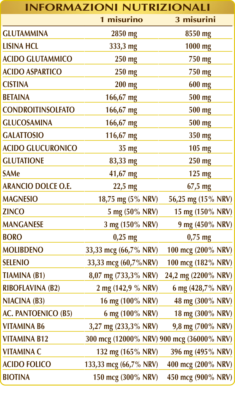 (L-)glutammina, maltodestrine da mais o riso, (L-)lisina HCL o cloridrato, (D-)glucosamina solfato (da fermentazione), acido (L-)glutammico, acido (L-)aspartico, (L-)cistina, fruttosio 1,6 difosfato, betaina, condroitinsolfato (da bovino), magnesio glicerofosfato, vitamina C (acido ascorbico), (D-)galattosio di origine vegetale, SAMe (S-adenosil metionina disolfato tosilato), glutatione ridotto, zinco gluconato, sodio glucuronato, manganese gluconato; aroma naturale: arancio dolce (Citrus aurantium var. sinensis o dulcis) scorze dei frutti O.E., vitamina B3 (nicotinamide); vitamina B1 (tiamina cloridrato), vitamina B5 (pantotenato di calcio), vitamina B6 attivata (piridossale-5-fosfato), vitamina B2 attivata (riboflavina 5-fosfato di sodio); edulcoranti di origine naturale: glicosidi steviolici da stevia, taumatina; sodio borato, vitamina B12 attivata (5-deossiadenosilcobalamina, metilcobalamina), biotina, acido folico attivato (L-metilfolato di calcio), sodio molibdato, sodio selenito.
