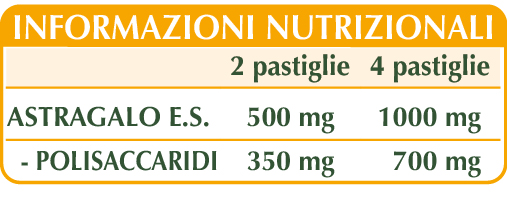 Astragalo (Astragalus membranaceus) radici E.S. (titolato al 70% in polisaccaridi), maltodestrine da mais o riso, cellulosa microcristallina°, gomma arabica°, silicio biossido°°, magnesio stearato di origine vegetale°°.