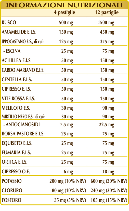Rusco o pungitopo (Ruscus aculeatus) radici polvere, potassio fosfato bibasico, potassio cloruro, amamelide (Hamamelis virginiana) foglie E.I.S., cellulosa microcristallina°, gomma arabica°, ippocastano (Aesculus hippocastanum) semi E.S. (titolato al 20% escina), potassio citrato, achillea (Achillea millefolium) erba con fiori E.I.S., cardo mariano (Silybum marianum) frutti E.I.S., centella (Centella asiatica) erba E.I.S., cipresso (Cupressus sempervirens) galbuli (frutti) E.I.S., vite rossa (Vitis vinifera) foglie E.I.S., meliloto (Melilotus officinalis) erba con fiori E.S. (titolato al 20% in cumarine), mirtillo nero (Vaccinium myrtillus) frutti E.S. (titolato al 25% in antocianosidi), borsa pastore (Capsella bursa-pastoris) erba E.I.S., equiseto o coda cavallina (Equisetum arvense) erba E.I.S., fumaria (Fumaria officinalis) erba con fiori E.I.S., ortica (Urtica dioica) foglie E.I.S., silicio biossido°°, cipresso (Cupressus sempervirens) foglie e rametti O.E., magnesio stearato di origine vegetale°°.