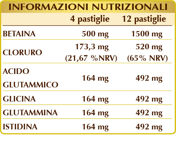 Betaina HCL o cloridrato, cellulosa microcristallina°, (L-)glutammina, glicina, acido (L-)glutammico, (L-)istidina, gomma arabica°, silicio biossido°°, potassio cloruro, magnesio stearato di origine vegetale°°.