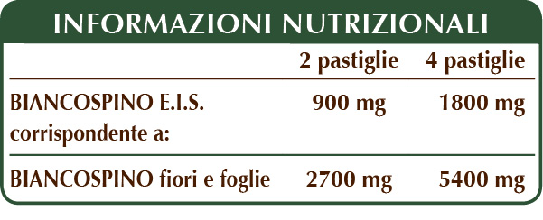 E.I.S.= Estratto integrale secco. L’estrazione delle piante eseguita da noi in azienda viene effettuata sottovuoto e a bassa temperatura per preservarne integri tutti i principi attivi e nutritivi, cioè il fitocomplesso; mediamente da 3 kg di piante otteniamo 1 kg di estratto secco (3:1). Eventuali variazioni nel colore delle pastiglie tra lotti diversi di prodotto, rispecchiano quelle naturali delle piante impiegate, in assenza di principi di sintesi.Prodotto adatto ai vegani.