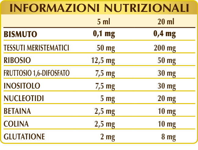 Glicerina vegetale bidistillata, acqua pura; macerato glicerico di tessuti meristematici freschi: carpino bianco (Carpinus betulus) gemme, lampone (Rubus idaeus) giovani getti, noce (Juglans regia) gemme, rosa canina (Rosa canina) giovani getti; ribosio, fruttosio 1,6-difosfato; correttore di acidità: acido citrico; inositolo, betaina citrato, colina tartrato; miscela di nucleotidi: AMP (adenosina monofosfato), CMP (citosina monofosfato), GMP (guanosina monofosfato), UMP (uridina monofosfato); glutatione ridotto; edulcorante di origine naturale: taumatina; bismuto potassio citrato. Con edulcoranti di origine naturale.