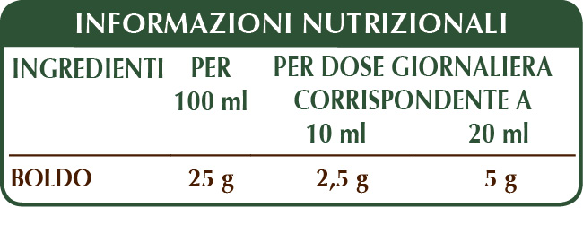 Estratto Integrale Liquido analcoolico ottenuto a partire da: glicerina vegetale bidistillata, acqua pura, boldo (Peumus boldus) foglie.