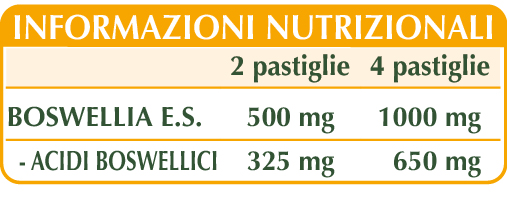 Boswellia (Boswellia serrata) gommo-resina E.S. (titolato al 65% in acidi boswellici), maltodestrine da mais o riso, cellulosa microcristallina°, gomma arabica°, silicio biossido°°, magnesio stearato di origine vegetale°°.