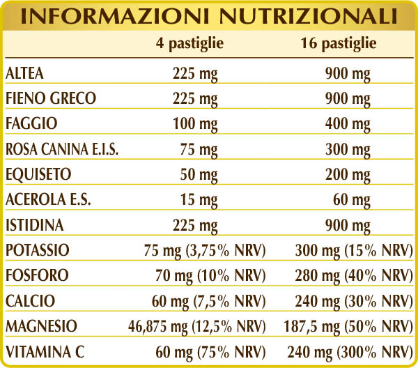 Calcio fosfato bibasico, altea (Althaea officinalis) radici Plv, fieno greco (Trigonella foenum-graecum) semi Plv, (L-)istidina, cellulosa microcristallina°, gomma arabica°, magnesio carbonato, potassio fosfato bibasico, faggio (Fagus sylvatica) catrame o pece (pix), rosa canina (Rosa canina) frutti E.I.S. (titolato al 70% in vitamina C), silicio biossido°°, equiseto o coda cavallina (Equisetum arvense) erba Plv, acerola (Malpighia glabra) frutti E.S. (titolato al 50% in vitamina C), magnesio stearato di origine vegetale°°. Plv= Polvere. °Agente di carica. °°Antiagglomerante.