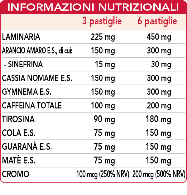 Cellulosa microcristallina°, laminaria (Laminaria digitata) tallo (alga) polvere, arancio amaro (Citrus aurantium var. amara) scorze dei frutti immaturi E.S. (titolato al 10% in sinefrina), cassia nomame (Cassia mimosoides var. nomame makino) foglie E.S. (titolato all’8% in dimeri flavanici), gymnema (Gymnema sylvestre) foglie E.S. (titolato al 75% in acido gymnemico), gomma arabica°, (L-)tirosina, cola (Cola acuminata) semi E.S. (titolato al 10% in caffeina), guaranà (Paullinia cupana) semi E.S. (titolato al 50% in caffeina), matè (Ilex paraguariensis) foglie E.S. (titolato all’8% in caffeina), silicio biossido°°, caffeina, magnesio stearato di origine vegetale°°, cromo picolinato.