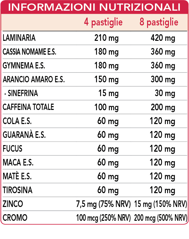 Laminaria (Laminaria digitata) tallo (alga) polvere, cassia nomame (Cassia mimosoides var. nomame makino) foglie E.S. (titolato all’8% in dimeri flavanici), gymnema (Gymnema sylvestre) foglie E.S. (titolato al 75% in acido gymnemico), cellulosa microcristallina°, gomma arabica°, arancio amaro (Citrus aurantium var. amara) scorze dei frutti immaturi E.S. (titolato al 10% in sinefrina), cola (Cola acuminata) semi E.S. (titolato al 10% in caffeina), fucus o quercia marina (Fucus vesiculosus) tallo (alga) polvere, guaranà (Paullinia cupana) semi E.S. (titolato al 50% in caffeina), (L-)tirosina, maca peruviana (Lepidium meyenii) radici E.S. (titolato al 2,5% in beta-sitosteroli), matè (Ilex paraguariensis) foglie E.S. (titolato all’8% in caffeina), caffeina, zinco gluconato, maltodestrine da mais o riso, silicio biossido°°, magnesio stearato di origine vegetale°°, cromo picolinato. °Agente di carica. °°Antiagglomerante.