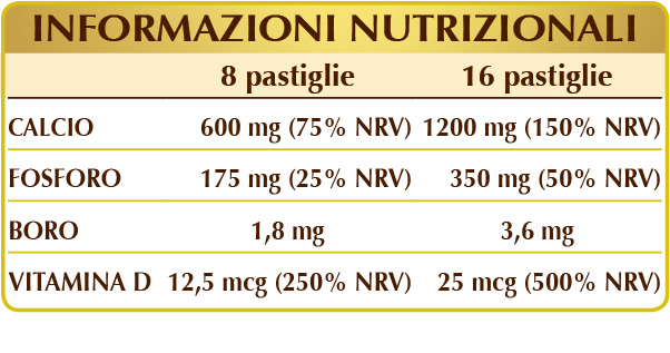 Integratore ricco di calcio, con fosforo, boro e vitamina D. La vitamina D favorisce l’assorbimento e l’utilizzo del calcio e del fosforo che, insieme ad essa, contribuiscono al mantenimento di ossa e denti normali. Il calcio può risultare utile a ridurre la perdita di minerale osseo nelle donne in post-menopausa, dai 50 anni in su, in cui una scarsa densità minerale ossea costituisce un fattore di rischio per le fratture osteoporotiche*. Calcio e vitamina D contribuiscono, inoltre, al mantenimento della funzione muscolare e intervengono nei processi di divisione delle cellule. Il calcio, infine, contribuisce alle normali neurotrasmissione e coagulazione del sangue e, insieme al fosforo, sostiene il metabolismo energetico.