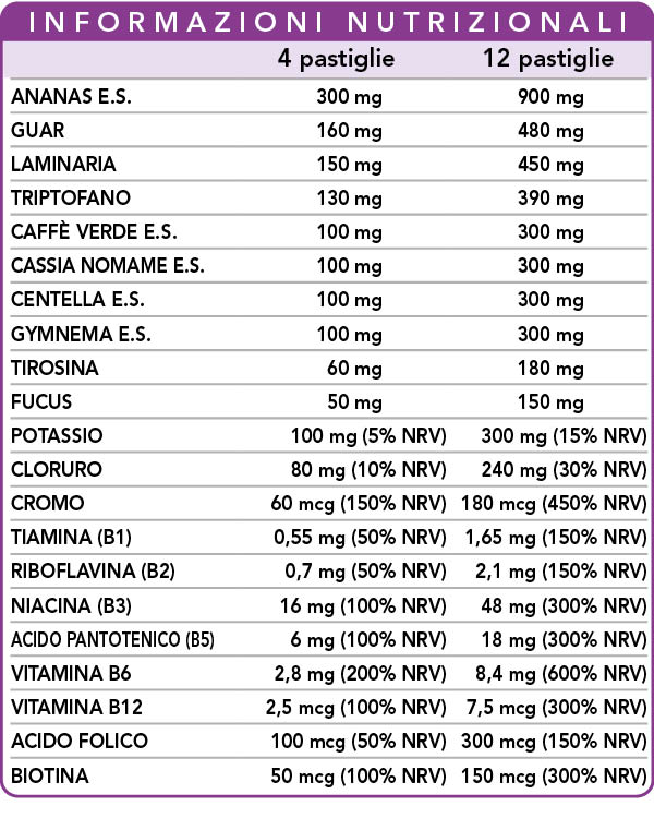 Ananas (Ananas comosus) gambi dei frutti E.S. (titolato a 2500 GDU/g in bromelina), cellulosa microcristallina°, potassio cloruro, gomma arabica°, gomma guar (Cyamopsis tetragonoloba) semi Plv, laminaria (Laminaria digitata) tallo (alga) Plv, (L-)triptofano, caffè (Coffea arabica) semi verdi (non torrefatti) E.S. (titolato al 50% in acido clorogenico e al 2% in caffeina), cassia nomame (Cassia mimosoides var. nomame makino) foglie E.S. (titolato all’8% in dimeri flavanici), centella (Centella asiatica) erba E.S. (titolato al 20% in derivati triterpenici totali, calcolati come asiaticoside), gymnema (Gymnema sylvestre) foglie E.S. (titolato al 75% in acido gymnemico), (L-)tirosina, fucus o quercia marina (Fucus vesiculosus) tallo (alga) Plv, potassio citrato, silicio biossido°°, magnesio stearato di origine vegetale°°, vitamina B3 (nicotinamide), vitamina B5 (pantotenato di calcio), vitamina B6 attivata (piridossale-5-fosfato), vitamina B2 attivata (riboflavina 5-fosfato di sodio), vitamina B1 (tiamina cloridrato), cromo picolinato, acido folico attivato (L-metilfolato di calcio), biotina, vitamina B12 attivata (5-deossiadenosilcobalamina, metilcobalamina). Plv= Polvere. ° Agente di carica. °° Antiagglomerante.