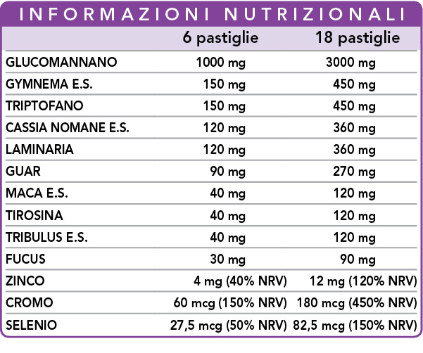 Il glucomannano contribuisce alla perdita di peso* mentre la guar facilita il senso di sazietà e limita l’assorbimento dei nutrienti. La gymnema aiuta a controllare il senso di fame mentre laminaria e fucus stimolano il metabolismo. La cassia nomame coadiuva il metabolismo di trigliceridi e colesterolo mentre la gymnema promuove il metabolismo dei carboidrati e, insieme al fucus, interviene nel metabolismo dei lipidi. Cassia nomame e fucus mantengono l’equilibrio del peso corporeo mentre maca e tribulus svolgono un’azione tonica utile per contrastare la stanchezza fisica e mentale. Il selenio favorisce la spermatogenesi mentre lo zinco contribuisce a mantenere i normali livelli di testosterone nel sangue promuovendo la riproduzione e la fertilità maschili.
