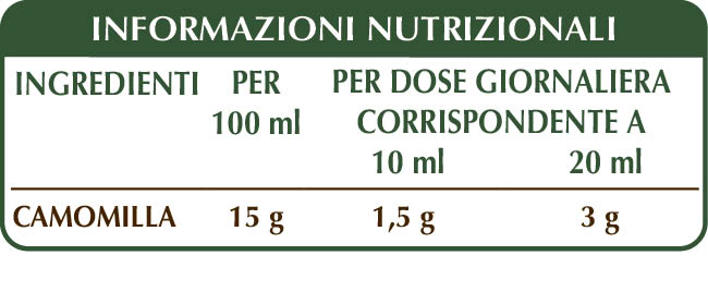 Estratto Integrale Liquido analcoolico ottenuto a partire da: glicerina vegetale bidistillata, acqua pura, camomilla volgare (Matricaria chamomilla) capolini (fiori).