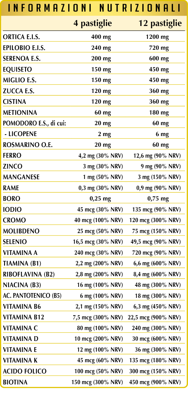 Ortica (Urtica dioica) radici e foglie E.I.S., cellulosa microcristallina°, gomma arabica°, epilobio (Epilobium angustifolium) erba E.I.S., serenoa o saw palmetto (Serenoa repens o Sabal serrulata) frutti E.S. (titolato al 45% in acidi grassi), equiseto o coda cavallina (Equisetum arvense) erba polvere, miglio (Panicum miliaceum) frutti E.S., (L-)cistina, zucca (Cucurbita pepo var. oleifera) semi E.S. (titolata al 40% in acidi grassi e allo 0,075% in beta-sitosteroli), vitamina C (acido ascorbico), (L-)metionina, silicio biossido°°, ferro gluconato, vitamina E di origine vegetale (acetato di D-α- tocoferile), zinco gluconato, pomodoro (Solanum lycopersicum) frutti E.S. (titolato al 10% in licopene), rosmarino (Rosmarinus officinalis) sommità fiorite O.E., vitamina B3 (nicotinamide), magnesio stearato di origine vegetale°°, manganese gluconato, vitamina B5 (pantotenato di calcio), vitamina B2 attivata (riboflavina 5-fosfato di sodio), lichene (Cladonia rangiferina) tallo E.S. (titolato in vitamina D3 colecalciferolo 100.000 UI/g), vitamina B6 attivata (piridossale-5-fosfato), vitamina B1 (tiamina cloridrato), sodio borato, rame gluconato, vitamina A (acetato di retinile), cromo picolinato, biotina, acido folico attivato (L-metilfolato di calcio), sodio molibdato, potassio ioduro, vitamina K1 (fillochinone), sodio selenito, vitamina B12 attivata (5-deossiadenosilcobalamina, meticobalamina).