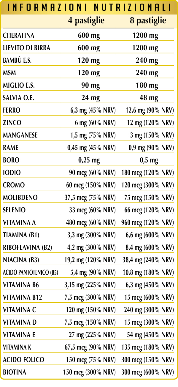 Cheratina idrolizzata, lievito di birra (Saccharomyces cerevisiae), cellulosa microcristallina°, gomma arabica°, bambù (Bambusa vulgaris) giovani fusti E.S. (titolato al 70% in silice), MSM (metilsulfonilmetano), vitamina C (acido ascorbico), miglio (Panicum miliaceum) semi E.S., vitamina E di origine vegetale (acetato di D-α-tocoferile), ferro gluconato, zinco gluconato, silicio biossido°°, salvia (Salvia officinalis) foglie O.E., vitamina B3 (nicotinamide), manganese gluconato, magnesio stearato di origine vegetale°°, vitamina B2 attivata (riboflavina 5-fosfato di sodio), vitamina B5 (pantotenato di calcio), vitamina B6 attivata (piridossale-5-fosfato), vitamina B1 (tiamina cloridrato), rame gluconato, vitamina A (acetato di retinile), lichene (Cladonia rangiferina) tallo E.S. (titolato in vitamina D3 colecalciferolo 100.000 UI/g), sodio borato, cromo picolinato, acido folico attivato (L-metilfolato di calcio), biotina, potassio ioduro, sodio molibdato, sodio selenito, vitamina K1 (fillochinone), vitamina B12 (5-deossiadenosilcobalamina, metilcobalamina). °Agente di carica. °°Antiagglomerante.