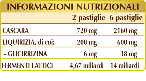 La cascara promuove la regolarità del transito intestinale e, insieme alla liquirizia, favorisce la funzione digestiva mentre i fermenti lattici contribuiscono all’equilibrio della flora batterica intestinale.
