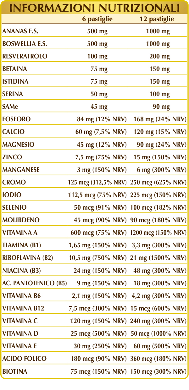 Ananas (Ananas comosus) gambi dei frutti E.S. (bromelina 2500 GDU/g), boswellia (Boswellia serrata) gommo-resina E.S. (titolato al 65% in acidi boswellici), cellulosa microcristallina°, gomma arabica°, calcio fosfato bibasico, magnesio glicerofosfato, vitamina C (acido ascorbico), resveratrolo di origine vegetale, SAMe (S-adenosil metionina disolfato tosilato), betaina, (L-)istidina, vitamina E di origine vegetale (acetato di D-α-tocoferile), silicio biossido°°, zinco gluconato, (L-)serina, magnesio ossido, manganese gluconato, vitamina B3 (nicotinamide), magnesio stearato di origine vegetale°°, vitamina B2 attivata (riboflavina 5-fosfato di sodio), lichene (Cladonia rangiferina) tallo E.S. (titolato in vitamina D3 colecalciferolo 100.000 UI/g), vitamina B5 (pantotenato di calcio), vitamina A (acetato di retinile), vitamina B6 attivata (piridossale-5-fosfato), vitamina B1 (tiamina cloridrato), cromo picolinato, acido folico attivato (L-metilfolato di calcio), potassio ioduro, sodio molibdato, sodio selenito, biotina, vitamina B12 attivata (5-deossiadenosilcobalamina, meticobalamina).