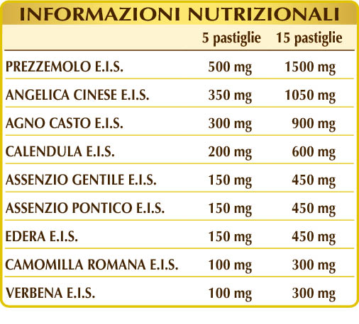 Prezzemolo (Petroselinum crispum) frutti E.I.S., angelica cinese (Angelica sinensis) radici E.I.S., agno casto (Vitex agnus-castus) frutti E.I.S., cellulosa microcristallina°, gomma arabica°, calendula (Calendula officinalis) capolini (fiori) E.I.S., assenzio gentile (Artemisia pontica) erba con fiori E.I.S., assenzio pontico (Artemisia vallesiaca) erba con fiori E.I.S., edera rampicante (Hedera helix) foglie E.I.S., camomilla romana (Anthemis nobilis) capolini (fiori) E.I.S., verbena (Verbena officinalis) erba con fiori E.I.S., silicio biossido°°, magnesio stearato di origine vegetale°°.