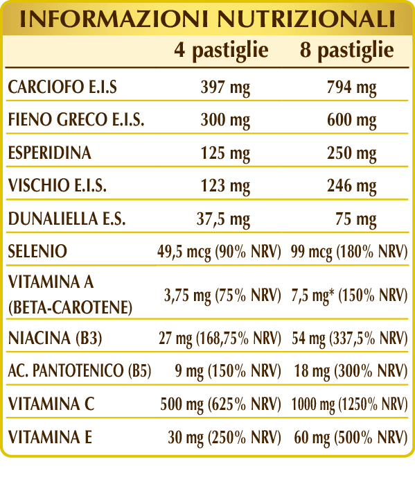 Vitamina C (acido ascorbico), carciofo (Cynara scolymus) foglie E.I.S., fieno greco (Trigonella foenum-graecum) semi E.I.S., esperidina da agrumi, vischio (Viscum album) foglie e rametti E.I.S., cellulosa microcristallina°, gomma arabica°, vitamina E di origine vegetale (acetato di D-α-tocoferile), silicio biossido°°, dunaliella (Dunaliella salina) tallo (alga) E.S. (titolato al 10% in beta-carotene), vitamina B3 (inositolo esanicotinato), vitamina B5 (pantotenato di calcio), magnesio stearato di origine vegetale°°, sodio selenito.