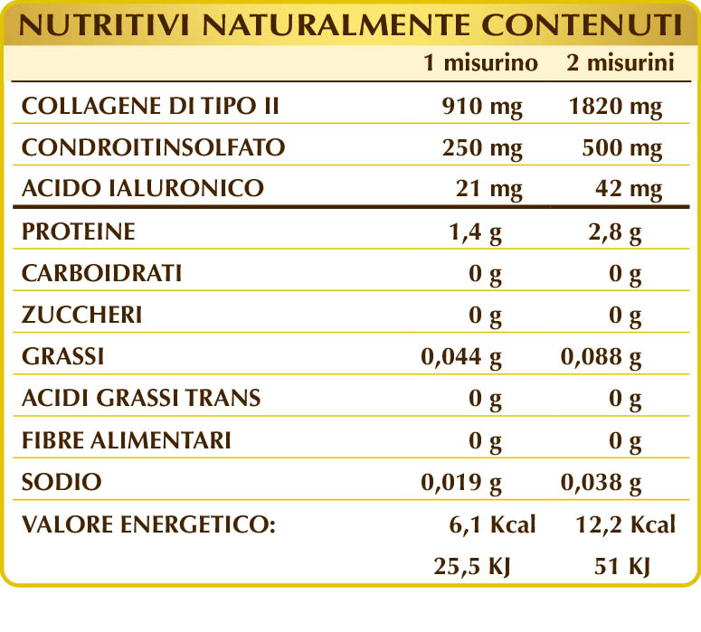 Collagene di tipo II da cartilagine idrolizzata di pollo polvere (al 52%), maltodestrine da mais o riso.