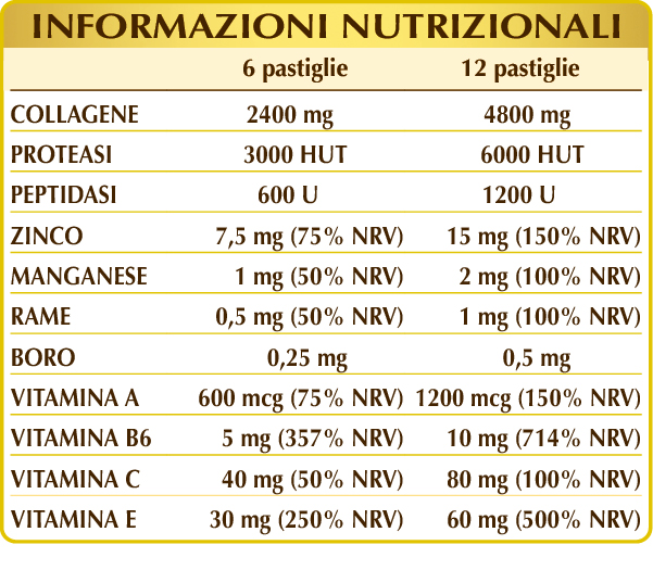 Collagene bovino idrolizzato, cellulosa microcristallina°, gomma arabica°, vitamina E di origine vegetale (acetato di D-α-tocoferile), zinco gluconato, vitamina C (acido ascorbico), silicio biossido°°, manganese gluconato, vitamina B6 attivata (piridossale-5-fosfato), proteasi (500.000 HUT/g), vitamina A (acetato di retinile), rame gluconato, peptidasi (200.000 U/g), magnesio stearato di origine vegetale°°, sodio borato.