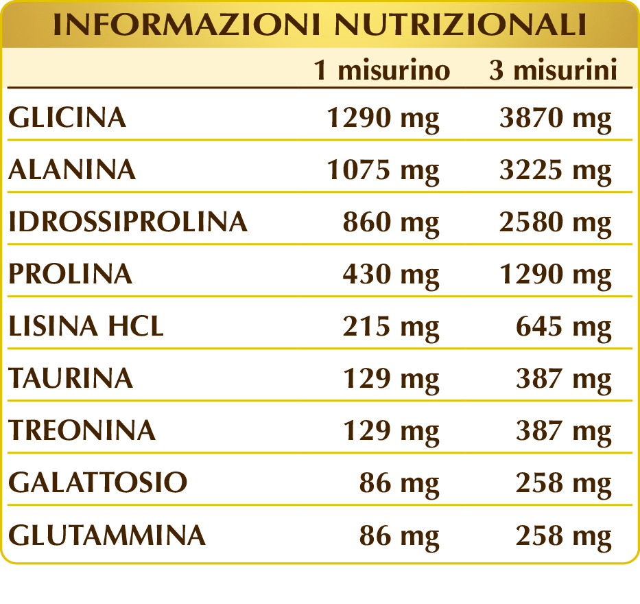 Glicina, (L-)alanina, (L-)idrossiprolina, (L-)prolina, (L-)lisina HCL o cloridrato, taurina, (L-)treonina, (D-)galattosio di origine vegetale, (L-)glutammina.