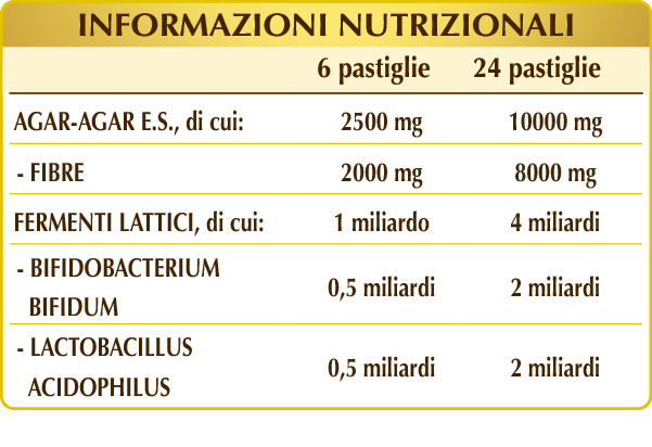 L’agar-agar è una fibra solubile che non viene digerita né assorbita dall’intestino; essa promuove la regolarità del transito intestinale e normalizza il volume e la consistenza delle feci. I fermenti lattici probiotici possono essere utili per riequilibrare la naturale flora batterica intestinale.
