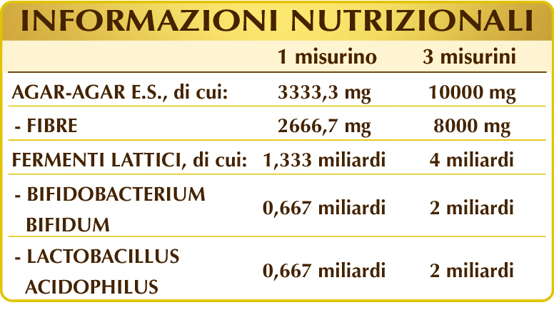 L’agar-agar è una fibra solubile che non viene digerita né assorbita dall’intestino; essa promuove la regolarità del transito intestinale e normalizza il volume e la consistenza delle feci. I fermenti lattici probiotici possono essere utili per riequilibrare la naturale flora batterica intestinale.