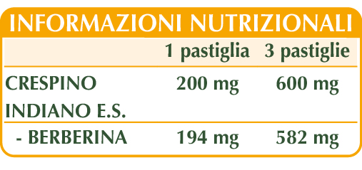 Crespino indiano (Berberis aristata) cortecce E.S. (titolato al 97% in berberina), maltodestrine da mais o riso, cellulosa microcristallina°, gomma arabica°, silicio biossido°°, magnesio stearato di origine vegetale°°.