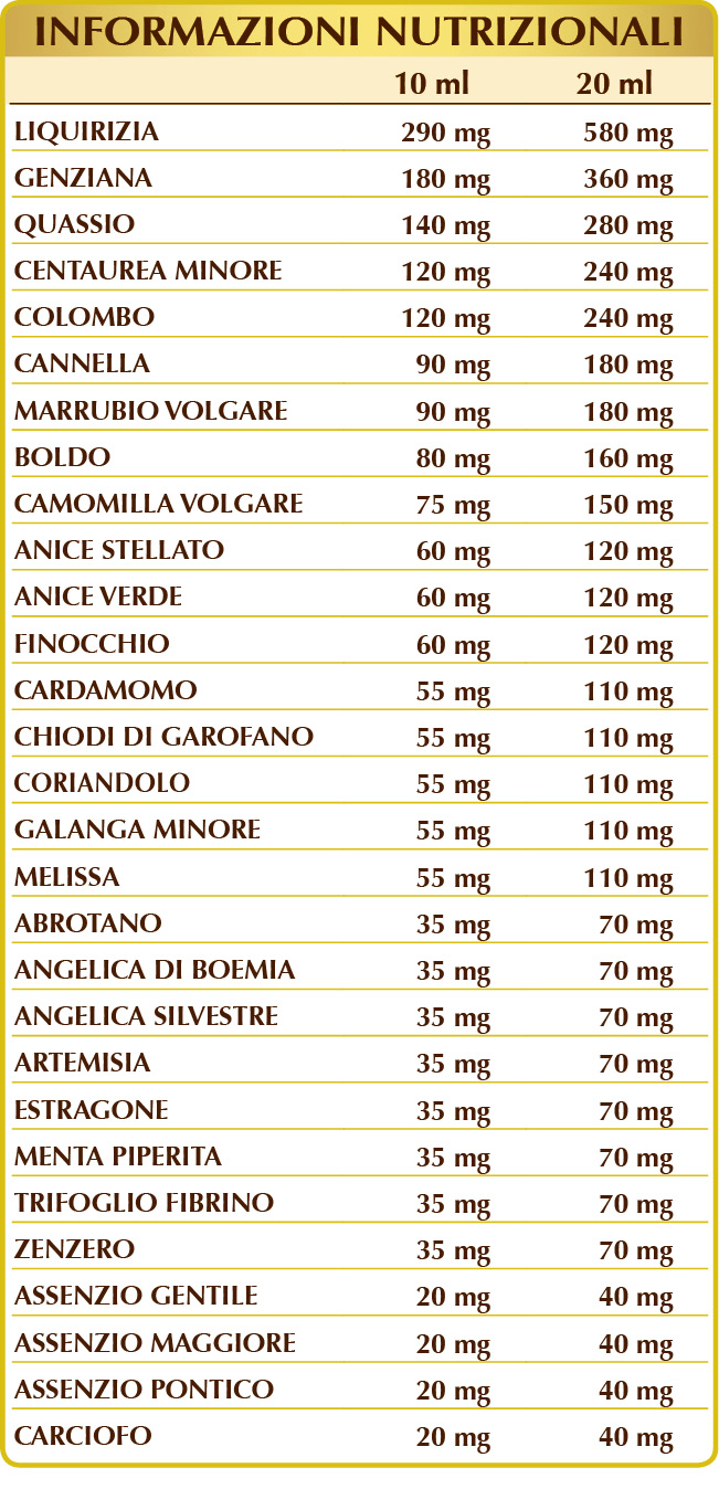 Acqua pura, alcool etilico (Alcoolvis®= Alcool purificato col metodo inventato dal Dott. Martino Giorgini), liquirizia (Glycyrrhiza glabra) radici E.I.L., genziana (Gentiana lutea) radici E.I.L., quassio (Quassia amara) legno E.I.L., centaurea minore (Centaurium erythraea) sommità E.I.L., colombo (Jateorhiza palmata) radici E.I.L., cannella (Cinnamomum zeylanicum) cortecce E.I.L., marrubio bianco o volgare (Marrubium vulgare) erba con fiori E.I.L., boldo (Peumus boldus) foglie E I.L., camomilla volgare (Matricaria chamomilla) capolini (fiori) E I.L., anice stellato (Illicium verum) frutti E.I.L., anice verde (Pimpinella anisum) frutti E.I.L., finocchio (Foeniculum vulgare) frutti E I.L., cardamomo (Elettaria cardamomum) semi E.I.L, chiodi di garofano (Eugenia caryophyllata) gemme floreali E.I.L., coriandolo (Coriandrum sativum) frutti E.I.L., galanga minore (Alpinia officinarum) rizomi E.I.L., melissa (Melissa officinalis) foglie E.I.L., abrotano (Artemisia abrotanum) sommità E.I.L., angelica di Boemia (Angelica archangelica) radici E.I.L., angelica silvestre (Angelica sylvestris) radici E.I.L., artemisia (Artemisia vulgaris) erba con fiori E.I.L., estragone (Artemisia dracunculus) foglie E.I.L., menta piperita (Mentha piperita) foglie E.I.L., trifoglio fibrino (Menyanthes trifoliata) foglie E.I.L., zenzero (Zingiber officinalis) rizomi E.I.L., assenzio gentile (Artemisia pontica) erba con fiori E.I.L., assenzio maggiore o romano (Artemisia absinthium) erba con fiori E.I.L., assenzio pontico (Artemisia vallesiaca) erba con fiori E.I.L., carciofo (Cynara scolymus) foglie E.I.L.