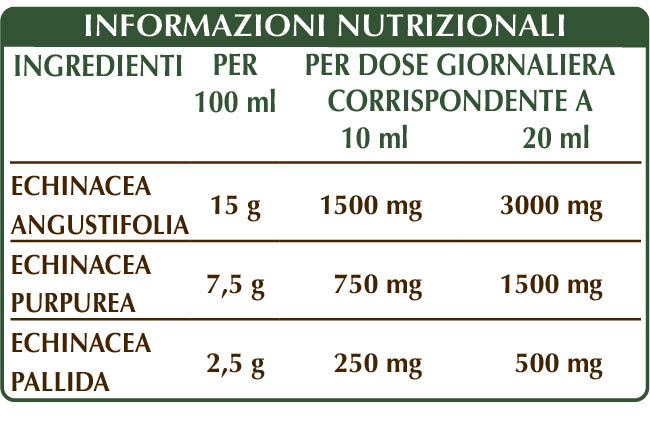 Estratto Integrale Liquido analcoolico ottenuto a partire da: glicerina vegetale bidistillata, acqua pura, echinacea (Echinacea angustifolia, purpurea e pallida) radici.