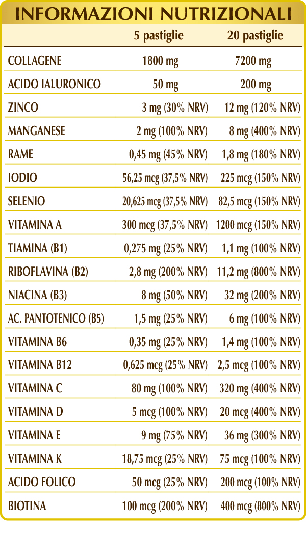 Collagene animale idrolizzato, cellulosa microcristallina°, gomma arabica°, vitamina C (acido ascorbico), sodio ialuronato, silicio biossido°°, zinco gluconato, manganese gluconato, vitamina E di origine vegetale (acetato di D-α-tocoferile), magnesio stearato di origine vegetale°°, vitamina B2 attivata (riboflavina 5-fosfato di sodio), vitamina B3 (nicotinamide), rame gluconato, lichene (Cladonia rangiferina) tallo E.S. (titolato in vitamina D3 colecalciferolo 100.000 UI/g), vitamina A (acetato di retinile), vitamina B5 (pantotenato di calcio), vitamina B6 attivata (piridossale-5-fosfato), vitamina B1 (tiamina cloridrato), biotina, potassio ioduro, acido folico attivato (L-metilfolato di calcio), sodio selenito, vitamina K1 (fillochinone), vitamina B12 attivata (5-deossiadenosilcobalamina, metilcobalamina). E.S.= Estratto secco. °Agente di carica. °°Antiagglomerante.