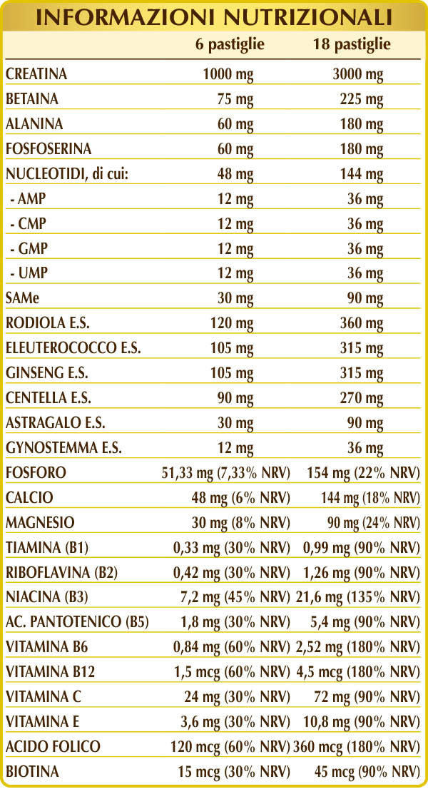 Creatina monoidrato, cellulosa microcristallina°, gomma arabica°, calcio fosfato bibasico, rodiola (Rhodiola rosea) radici E.S. (titolato al 3% in salidroside), eleuterococco o ginseng siberiano (Eleutherococcus senticosus) radici E.S. (titolato allo 0,8% in eleuteroside), ginseng (Panax ginseng) radici E.S. (titolato al 20% in ginsenosidi), centella (Centella asiatica) erba E.S. (titolato al 20% in derivati triterpenici), betaina, creatina citrato, creatina fosfato, (DL-)fosfoserina, (L-)alanina, SAMe (S-adenosil metionina disolfato tosilato), gelatina alimentare, silicio biossido°°; miscela di nucleotidi: AMP (adenosina monofosfato), CMP (citosina monofosfato), GMP (guanosina monofosfato), UMP (uridina monofosfato); magnesio ossido, astragalo (Astragalus membranaceus) radici E.S. (titolato al 70% in polisaccaridi), magnesio glicerofosfato, vitamina C (acido ascorbico), magnesio stearato di origine vegetale°°, gynostemma (Gynostemma pentaphyllum) erba E.S. (titolato al 80% in gypenosidi), vitamina E di origine vegetale (acetato di D-α-tocoferile), vitamina B3 (nicotinamide), vitamina B5 (pantotenato di calcio), vitamina B6 attivata (piridossale-5-fosfato), vitamina B2 attivata (riboflavina 5-fosfato di sodio), vitamina B1 (tiamina cloridrato), acido folico attivato (L-metilfolato di calcio), biotina, vitamina B12 attivata (5-deossiadenosilcobalamina, metilcobalamina). °Agente di carica. °°Antiagglomerante.