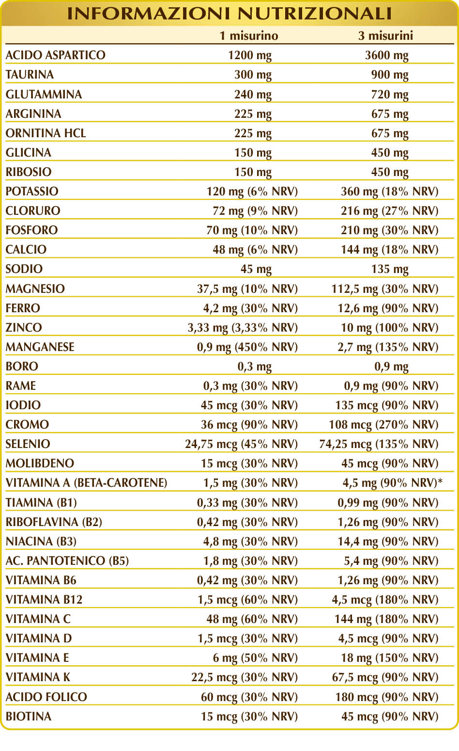 Maltodestrine da mais o riso, acido (L-)aspartico, limone (Citrus limon) frutti S.D., taurina, calcio glicerofosfato, (L-)glutammina, magnesio glicerofosfato, (L-)arginina, (L-)ornitina HCL o cloridrato, sodio citrato, potassio cloruro; correttore di acidità: acido citrico; glicina, glucosio (destrosio), ribosio, potassio citrato, magnesio citrato bibasico, vitamina C (acido ascorbico), citrato ferrico di ammonio, zinco gluconato, beta-carotene (titolato al 10%), vitamina E (acetato di DL-α-tocoferile), manganese gluconato; edulcoranti di origine naturale: glicosidi steviolici da stevia, taumatina; vitamina B3 (nicotinamide), sodio borato, vitamina B5 (pantotenato di calcio), rame solfato, vitamina B2 attivata (riboflavina 5-fosfato di sodio), vitamina B6 attivata (piridossale-5-fosfato), vitamina D3 (colecalciferolo 100.000 UI/g), vitamina B1 (tiamina cloridrato), cromo picolinato, acido folico attivato (L-metilfolato di calcio), potassio ioduro, sodio selenito, sodio molibdato, vitamina K1 (fillochinone), biotina, vitamina B12 attivata (5-deossiadenosilcobalamina, meticobalamina).