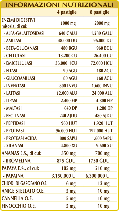 Integratore alimentare a base di enzimi digestivi di origine vegetale e oli essenziali. Gli estratti di ananas e papaya, con gli oli essenziali di chiodi di garofano, anice stellato, cannella e finocchio, favoriscono la funzione digestiva. Inoltre, tutti gli oli essenziale contenuti contribuiscono alla regolare motilità gastrointestinale e all’eliminazione dei gas.