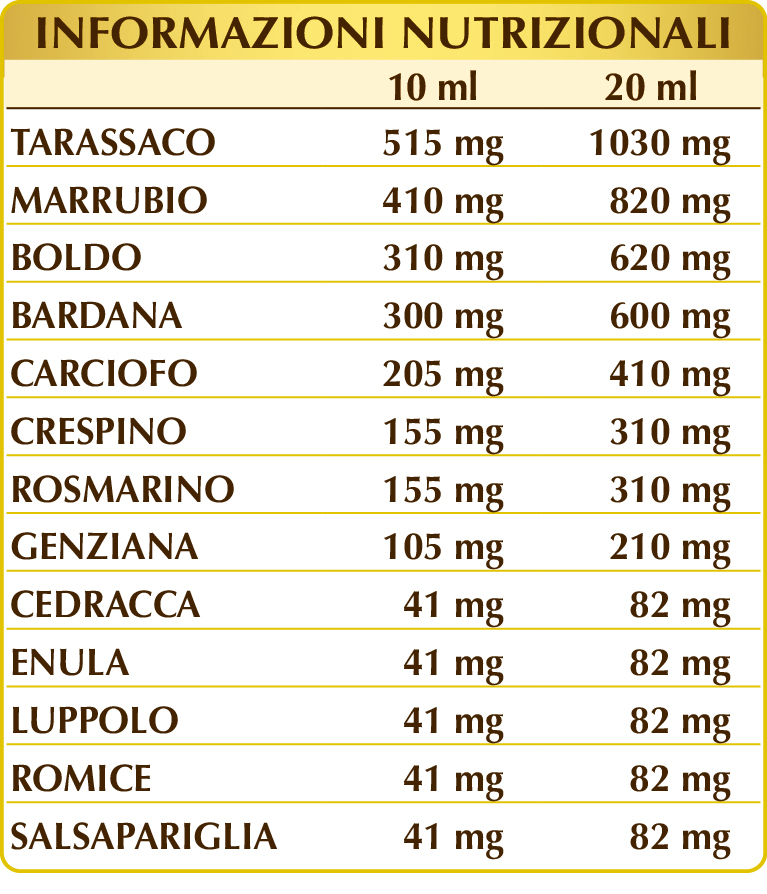 Tarassaco, boldo, carciofo, crespino, rosmarino e genziana favoriscono la normale funzionalità epatica. Marrubio, enula e luppolo promuovono la funzione digestiva, mentre romice, salsapariglia e bardana coadiuvano la naturale funzionalità depurativa dell’organismo.