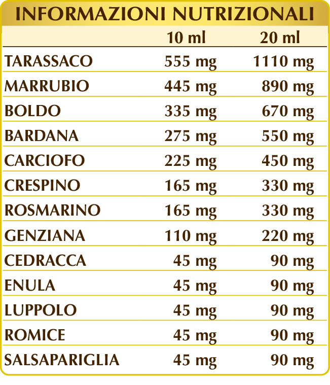 Tarassaco, boldo, carciofo, crespino, rosmarino e genziana favoriscono la normale funzionalità epatica. Marrubio, enula e luppolo promuovono la funzione digestiva, mentre romice, salsapariglia e bardana coadiuvano la naturale funzionalità depurativa dell’organismo.